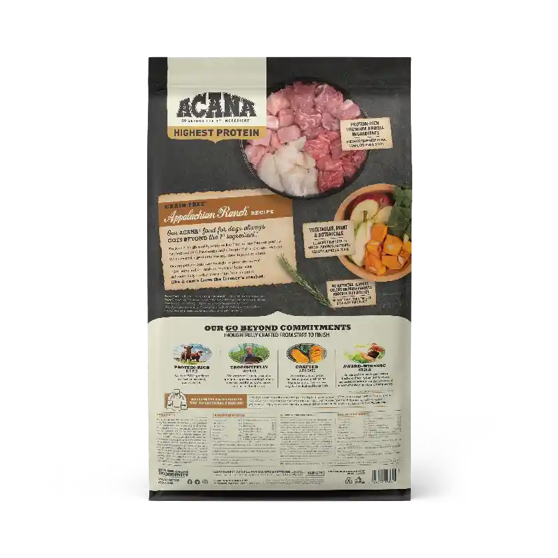 Our ACANAยฎ foods always goes beyond the 1st ingredient, thoughtfully crafting our recipes from start to finish. With a recipe blend inspired by Kentuckyโs fertile lands, ACANAยฎ Appalachian Ranch is crafted with 70%* quality animal ingredients like ranch-raised beef, Yorkshire pork, grass-fed lamb, catfish and bison, and 30%+ fruits, vegetables, and botanicals, many delivered daily. Artificial colors, flavors or preservatives are never added in our kitchen. Our premium ingredients come from a curated group of farmers, ranchers and fishers weโve known and trusted for decades, and we approach every batch with an unsurpassed commitment to safety and quality in our award-winning Kentucky kitchen. The result is a protein-rich, nutritious, and delicious dog food to help them live a healthy, happy life. *approximate and derived from the unprocessed state of the ingredients. +we also add vitamins, minerals, natural preservatives and probiotics.