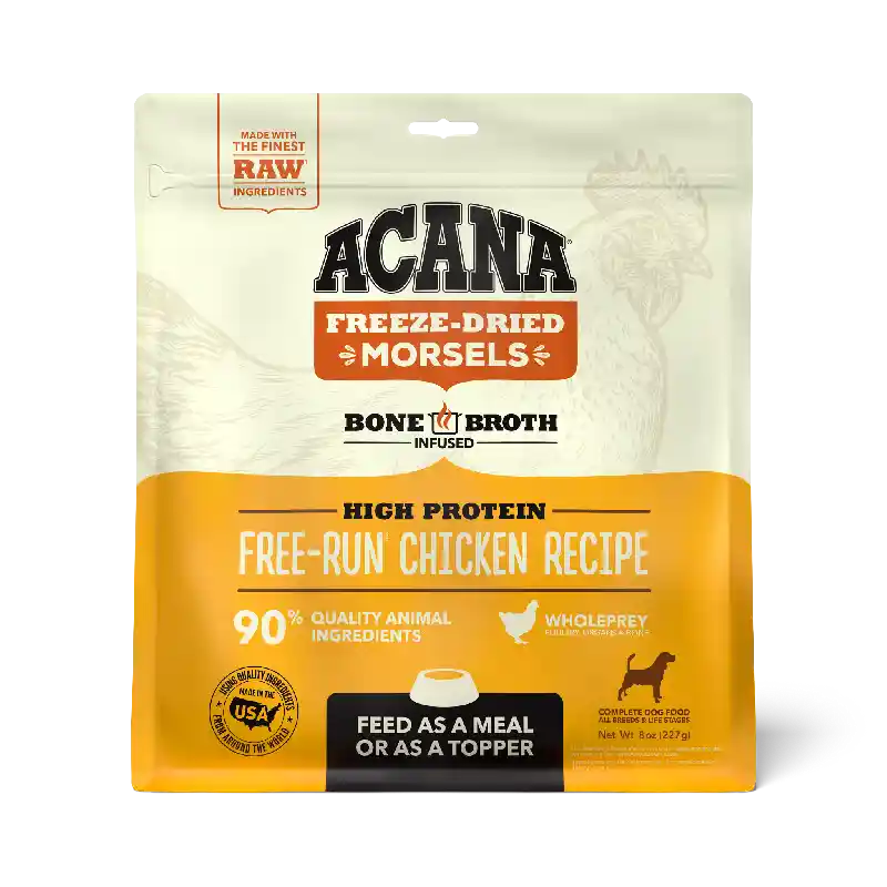 ACANAยฎ Freeze-Dried Food gives your dog all the benefits of raw nutrition, with none of the mess! Available in bite sized morsels or breakable patties, our Free-Run* Chicken Recipe satisfies your dogโs natural cravings in a convenient, freeze-dried form. Itโs made from 90% quality animal ingredients** including free-run1 chicken, organs bone and broth, and balanced with wholesome vegetables and fruit. Itโs also infused with hearty and delicious bone broth for a taste dogs love. Satisfy your dogโs cravings with the nutritious animal ingredients in ACANA Freeze-Dried Food! 1Our free-run chickens and turkeys are not housed in cages and are able to move in a barn without outdoor access. 2Approximate and derived from the unprocessed state of the ingredients