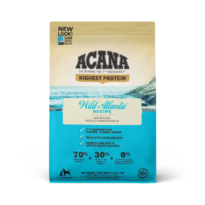 Our ACANAยฎ food for dogs always goes beyond the 1st ingredient, thoughtfully crafting our recipes from start to finish. With a recipe blend inspired by America's cold waters, ACANA Wild Atlantic is crafted with 70%* quality animal ingredients like whole mackerel, herring, redfish, silver hake, and flounder, and 30%+ fruits, vegetables, and botanicals, many delivered daily. Artificial colors, flavors or preservatives are never added in our kitchen. Our premium ingredients come from a curated group of farmers, ranchers and fishers weโve known and trusted for decades, and we approach every batch with an unsurpassed commitment to safety and quality in our award-winning Kentucky kitchen. The result is a protein-rich, nutritious, and delicious dog food to help them live a healthy, happy life. *approximate and derived from the unprocessed state of the ingredients. +we also add vitamins, minerals, natural preservatives and probiotics.