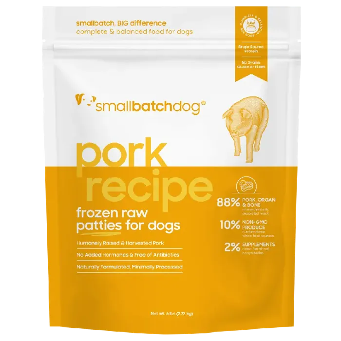 Smallbatch Pork Sliders Frozen Raw Dog Food is 88% Pork, 10% vegetables and 2% supplements.