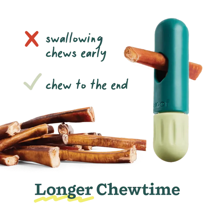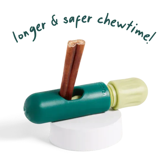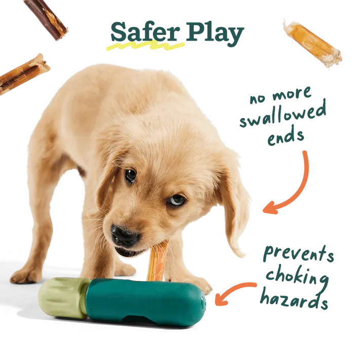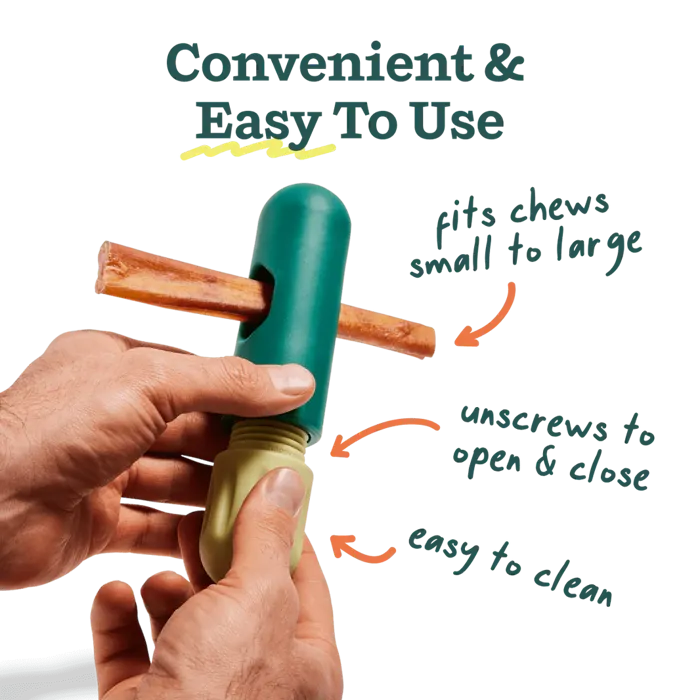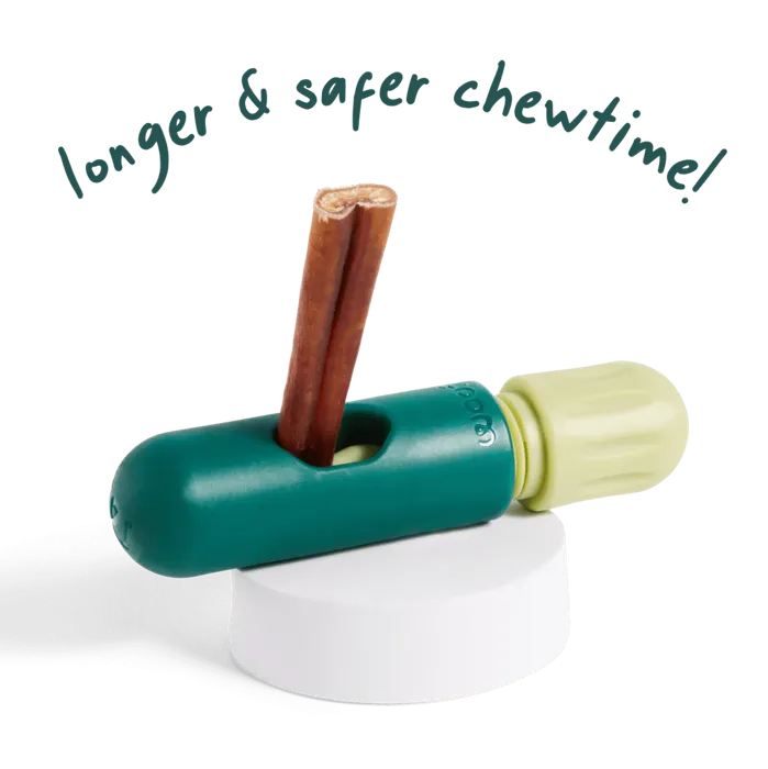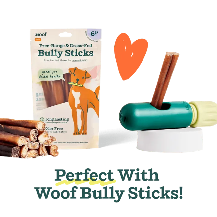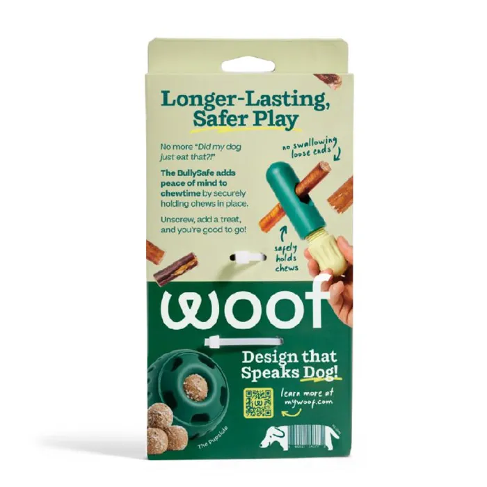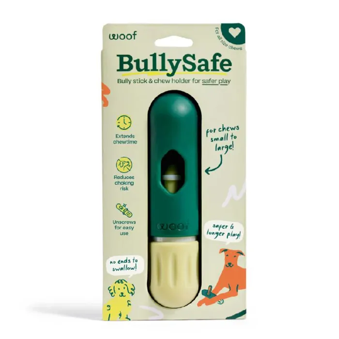The BullySafe offers peace of mind by promoting proper chewing, making each treat last longer for more enjoyment (and bully stick savings!). Itโs crafted from tough, non-toxic nylon to withstand even the most serious chewers, so pups can enjoy their chews without the risk of choking or swallowing big pieces. The easy-to-use, adjustable design fits chews of all sizes, and itโs a perfect fit with grass-fed, free-range Woof Bully Sticks.